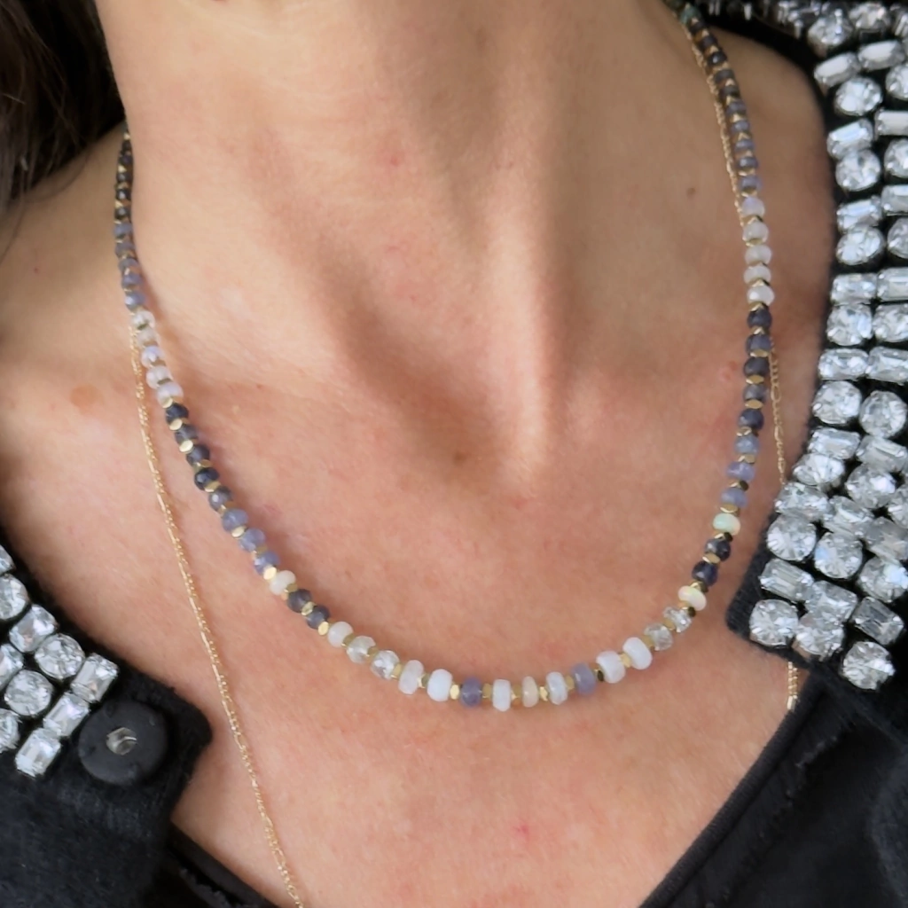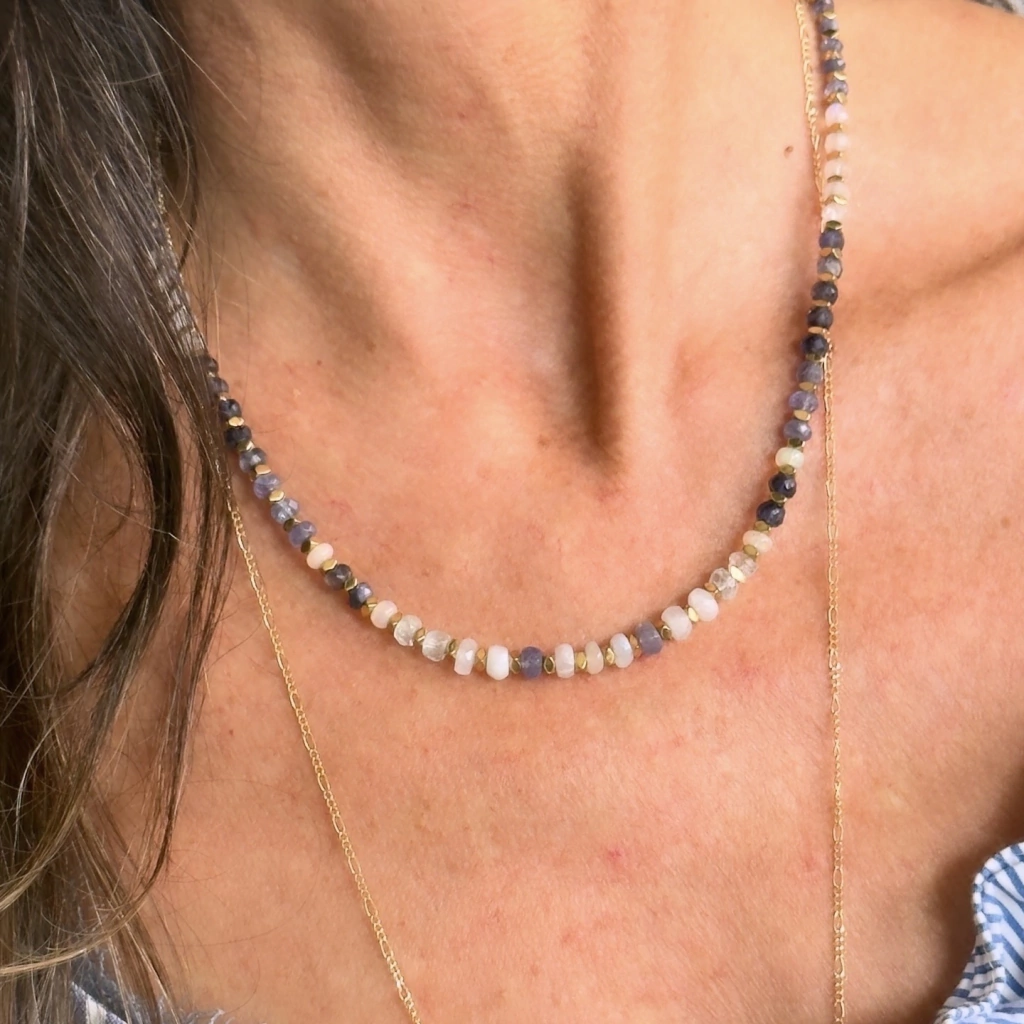 Collar realizado con rondelles de 3 a 5 mm de espesor de opalo, piedra luna, aguamarina, apatita, iolita y tanzanita